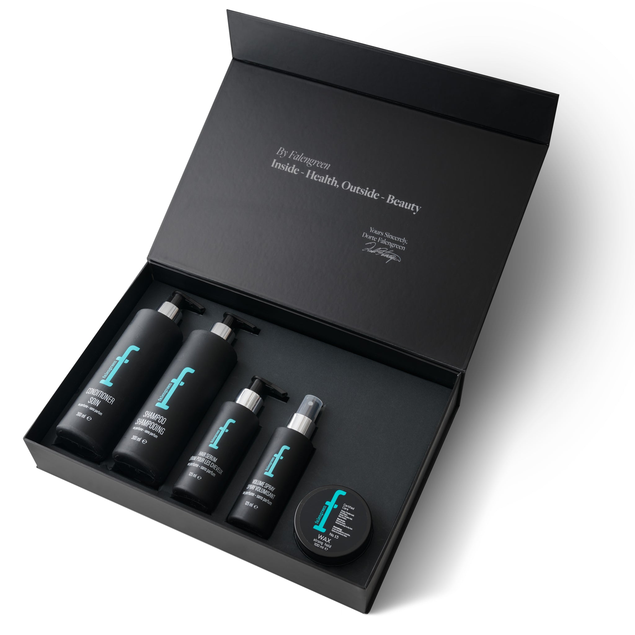 Combo Boxen indeholder 1x 300ml Conditioner, 1x 300ml Shampoo, 1x 125ml Hair Serum, 1x 125 ml Volume Spray & 1x 100 ml Wax.